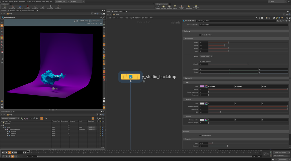 Specially designed for Houdini Solaris/LOPs, and seamlessly compatible with Karma & Redshift renderers, the asset allows you to have full control over the backdrop's appearance with an array of adjustable parameters.